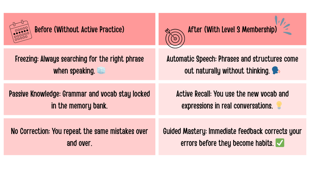 The problem is the "Fluency Trap": You have high input (listening/reading) but zero active output (speaking/writing). Without structured practice and correction, the knowledge stays passive in your brain.